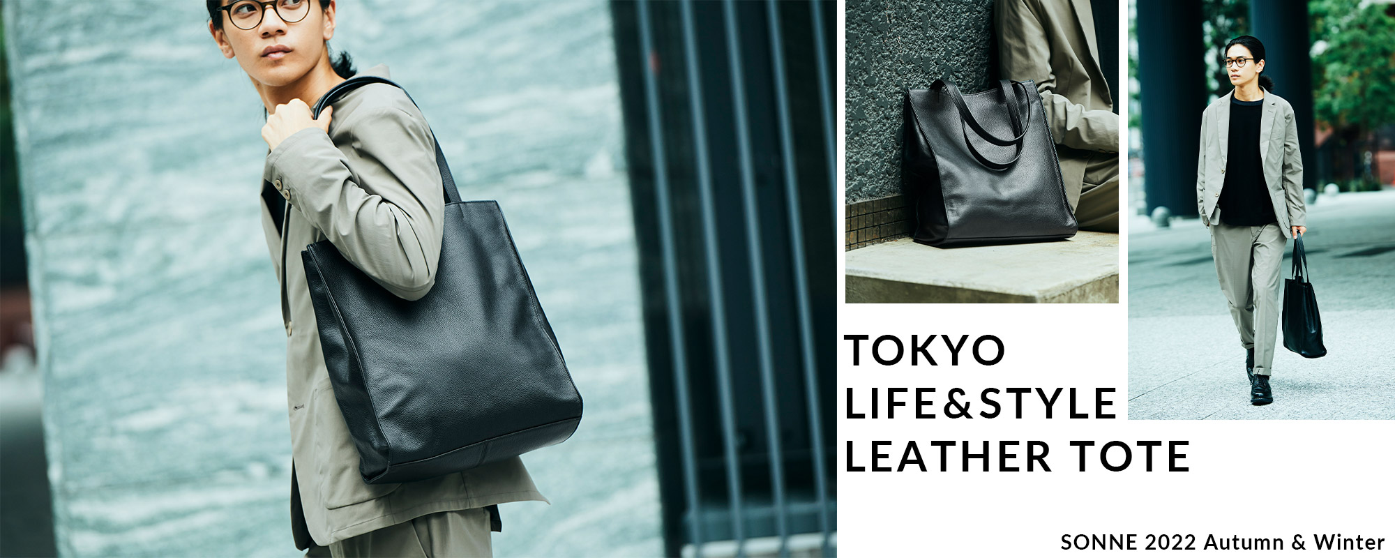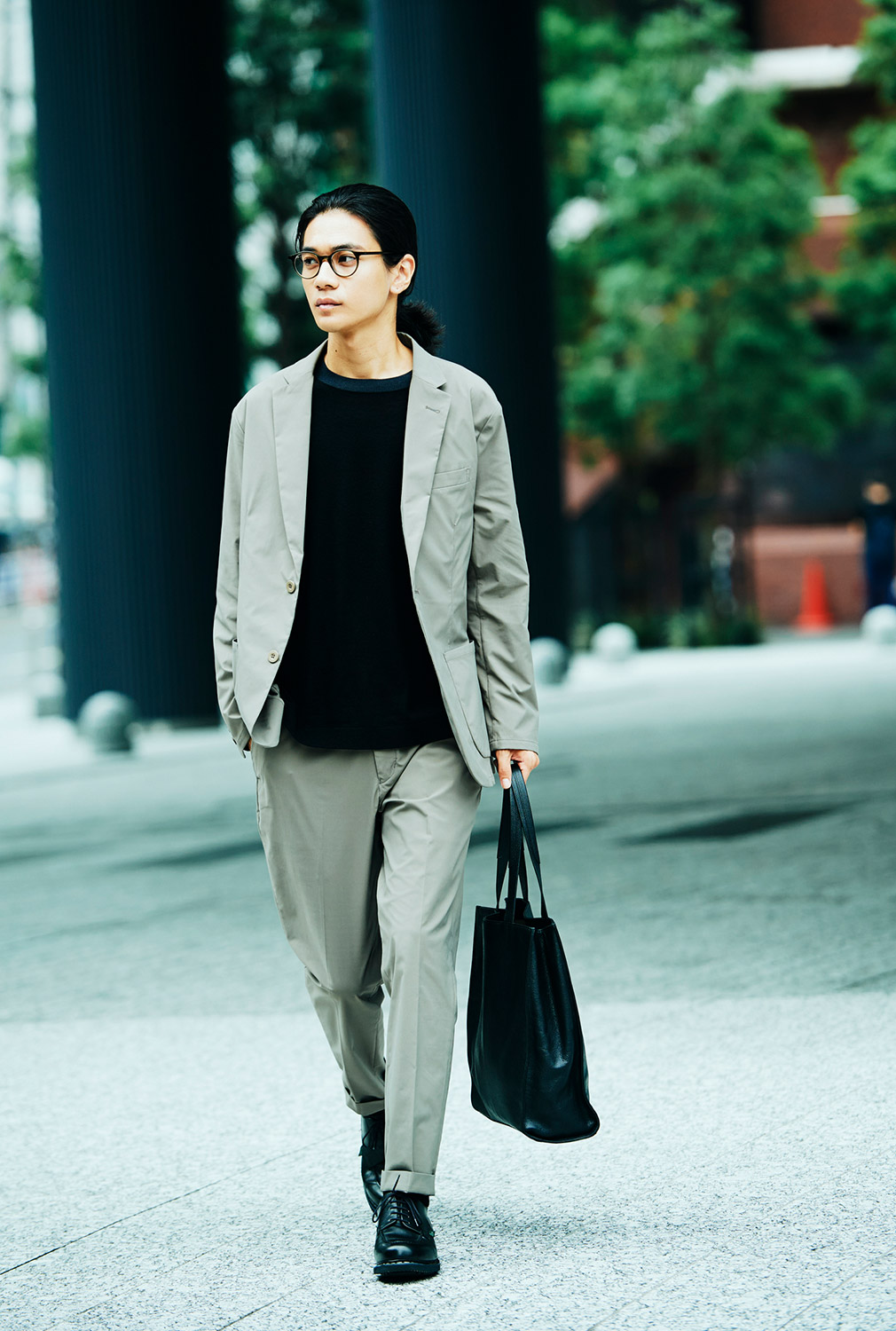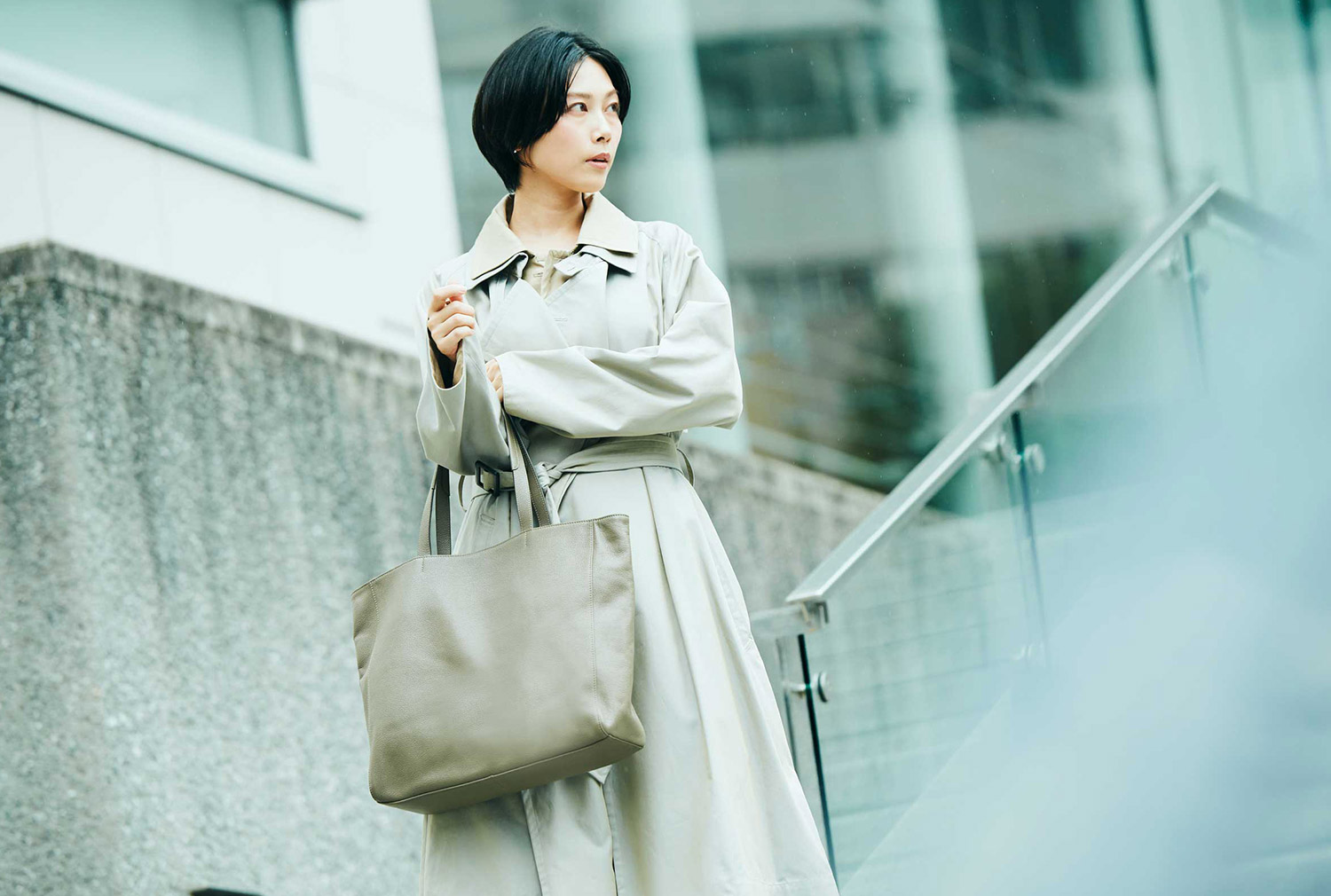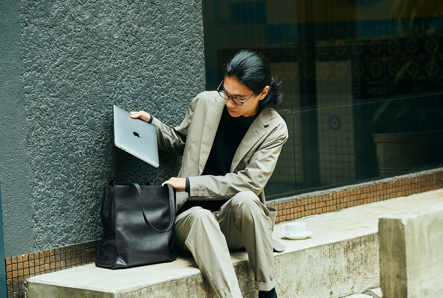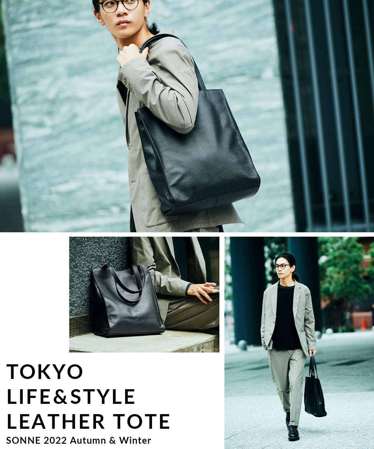 ベージュを基調とした大人な仕事スタイルには、ジェンダーの垣根を感じさせない「トープ」カラーがお洒落。レザーについたシワさえも、着こなしに奥行を持たせるニュアンスに。
