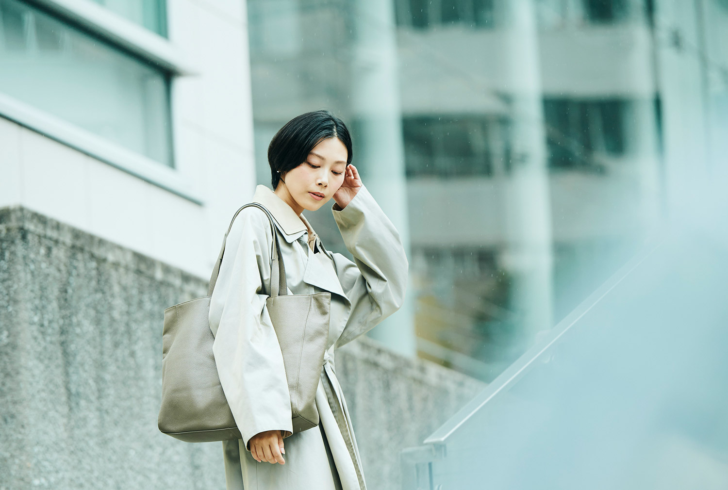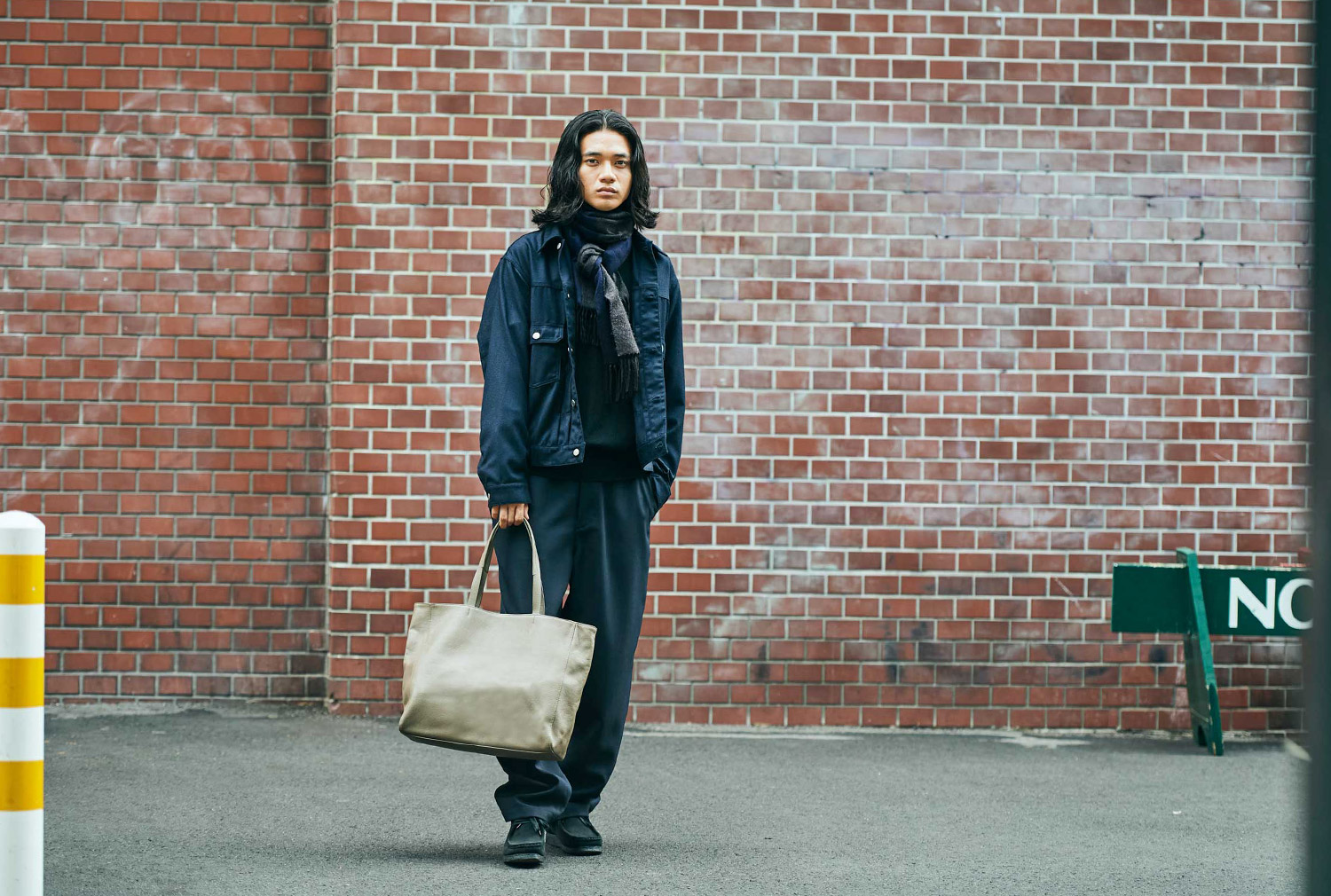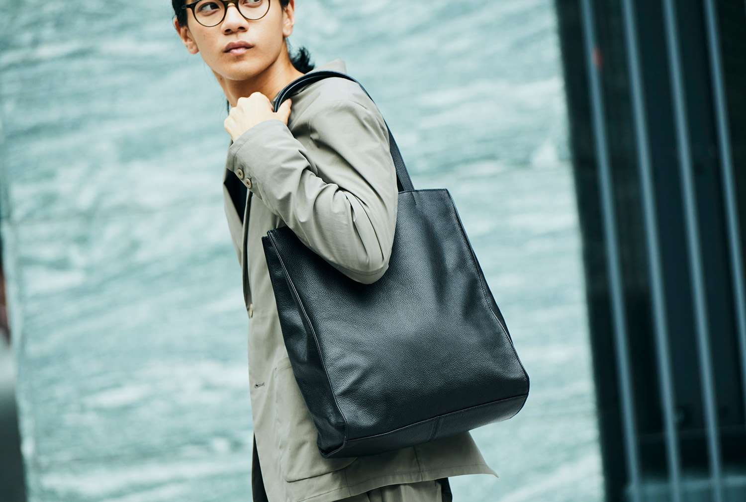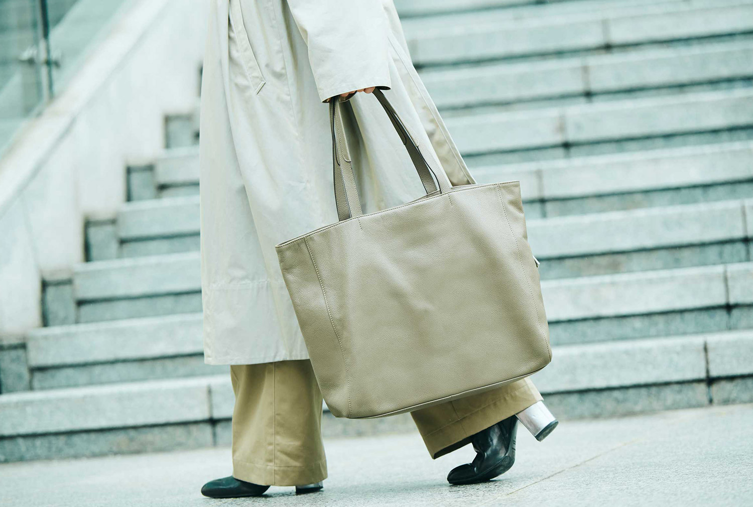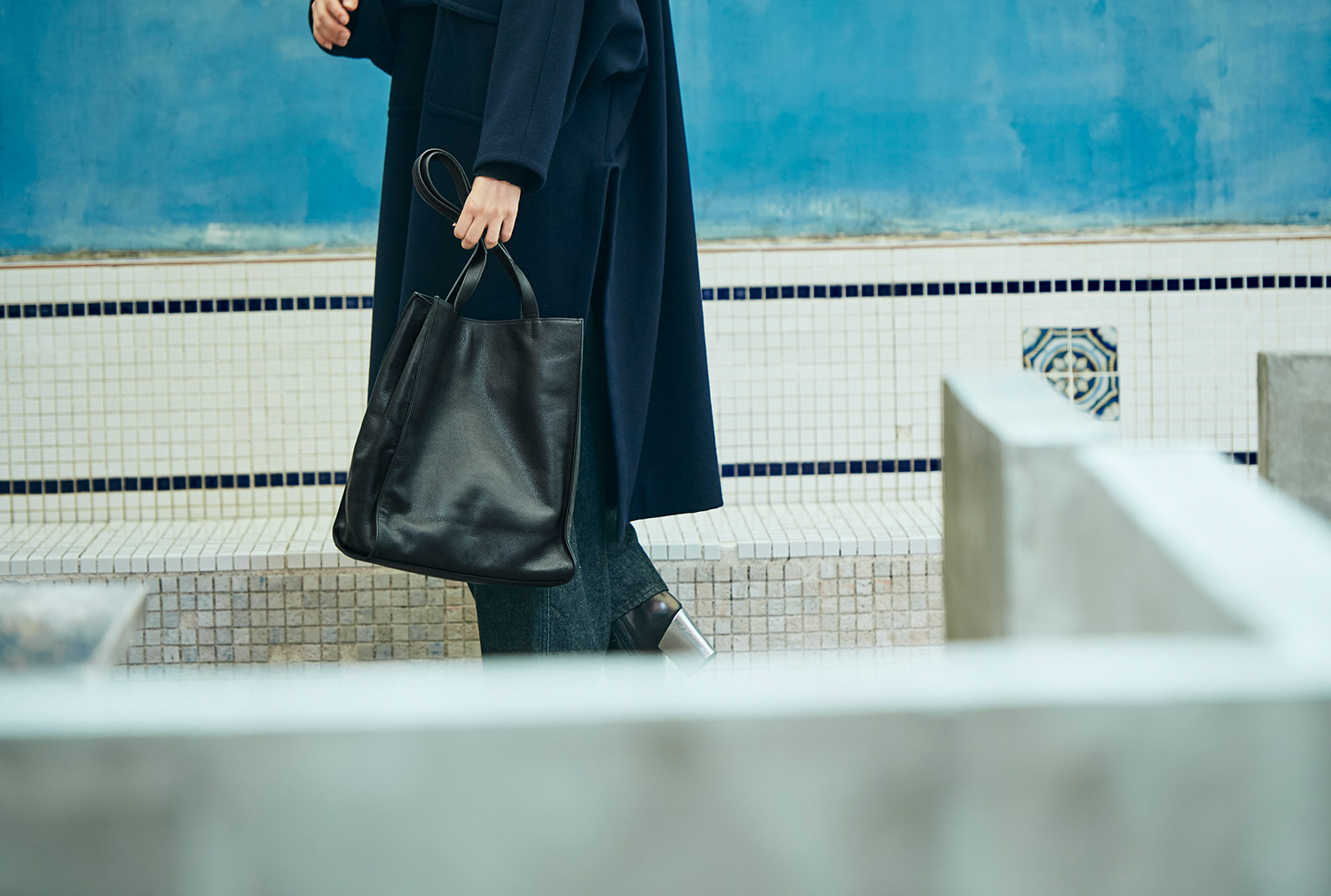 やわらかいレザーの縦型トートは、コートのシルエットを邪魔しないし、クシャっと持つと光の加減でニュアンスが現れる。正直中身は財布とスマホ、ハンカチと鍵、それとちょっとしたコスメくらい。でもコーデのスパイスに、重厚感あるこのバッグが重宝するのだ。