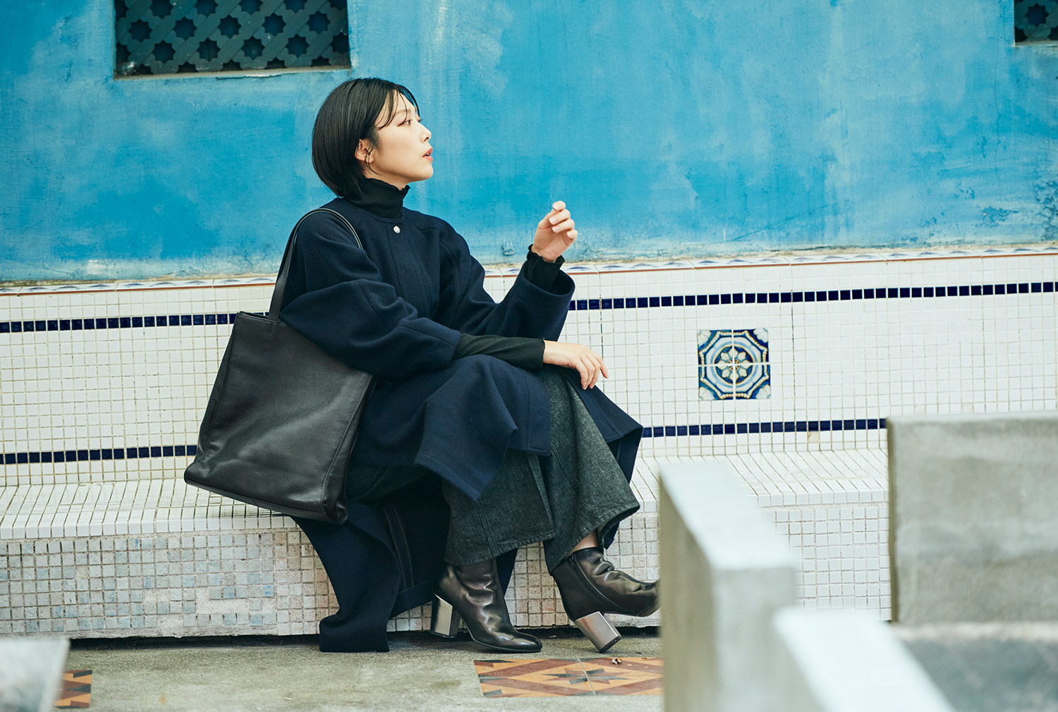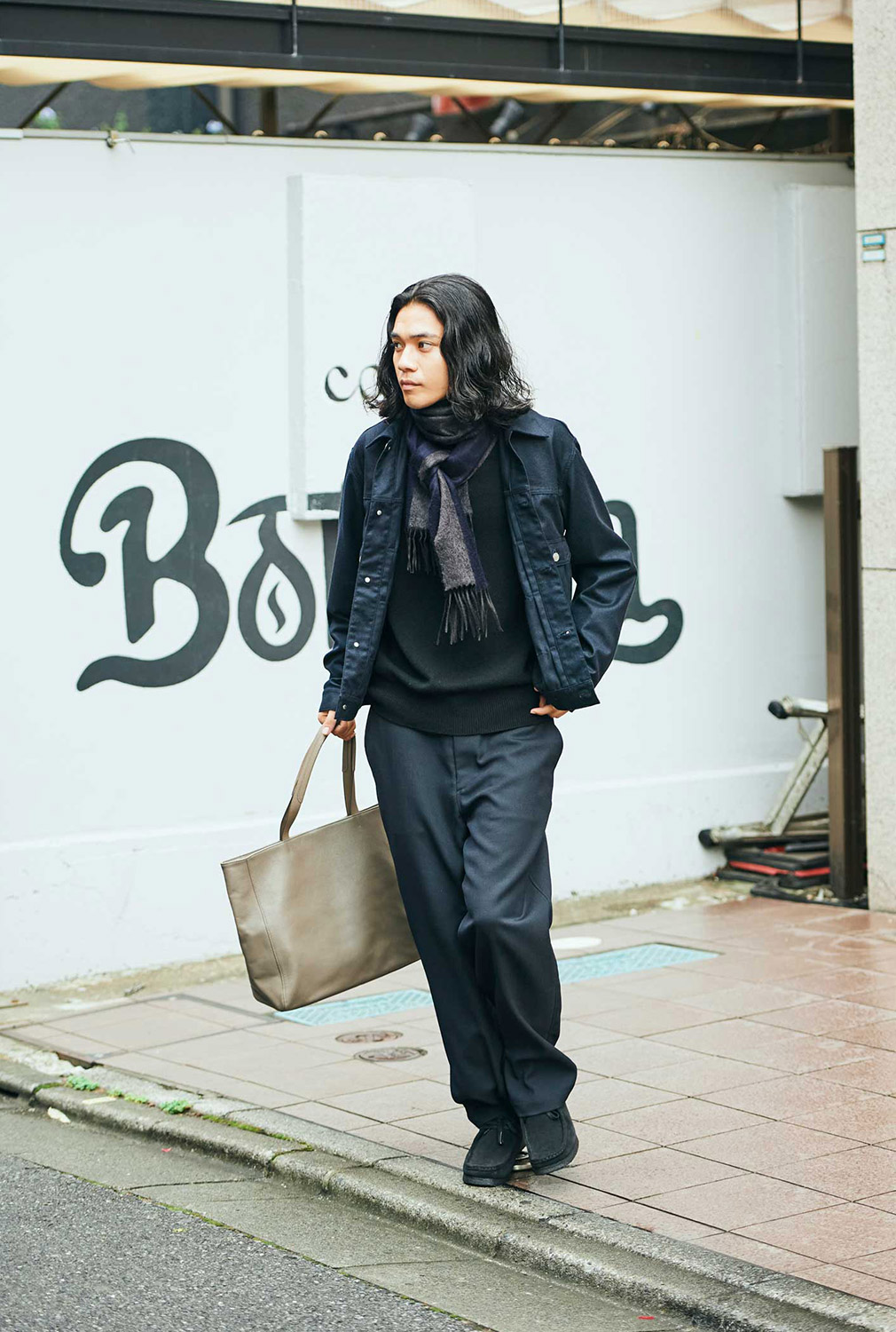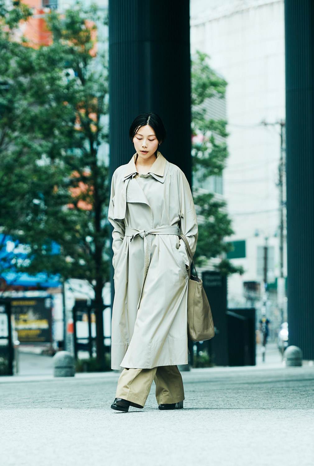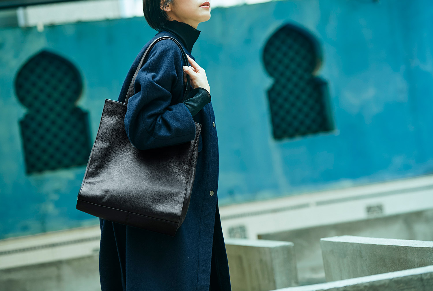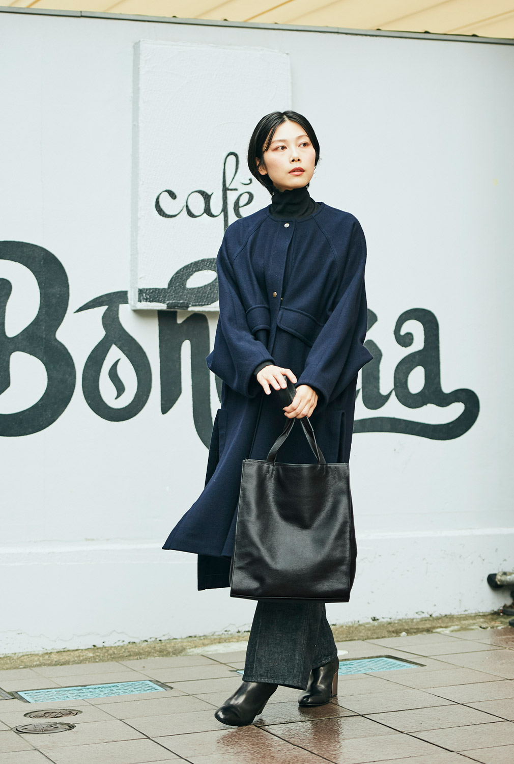 ちょっと足を伸ばしてみたりして、アートを感じる週末は、落ち着いた色みのモードな着こなしがいい。トップスとパンツ、足元もブラックで辛口に。Iラインがきれいなコートには、どちらかというと舟形より縦型のトートバッグが似合うはず……ほらね