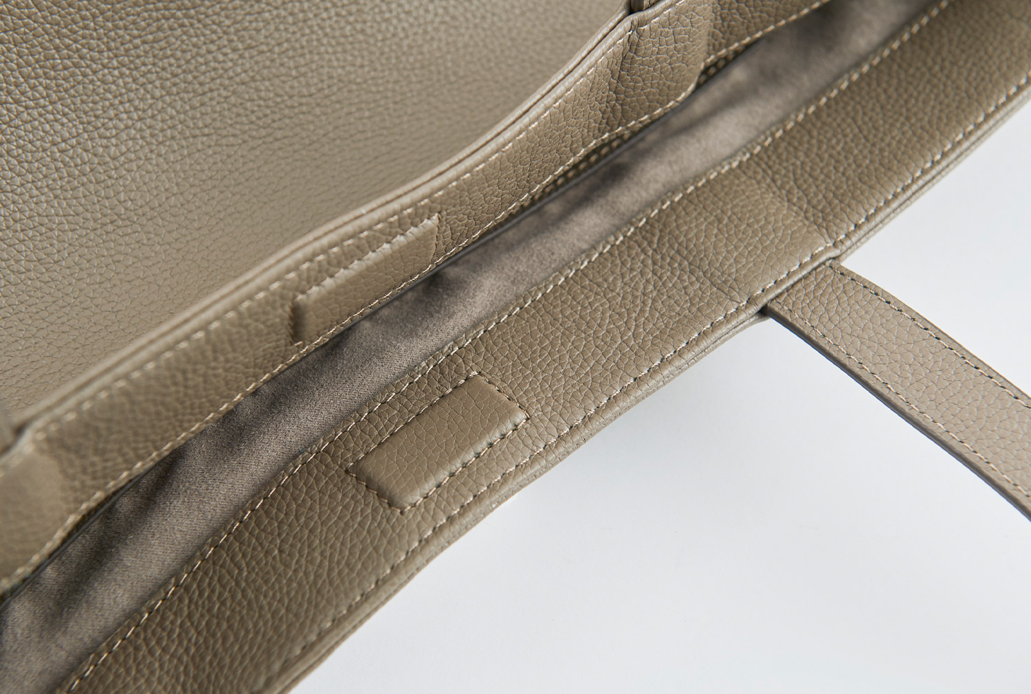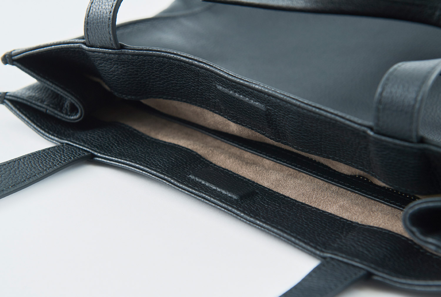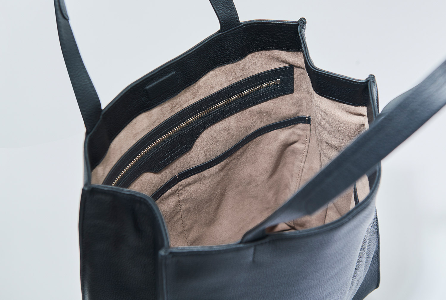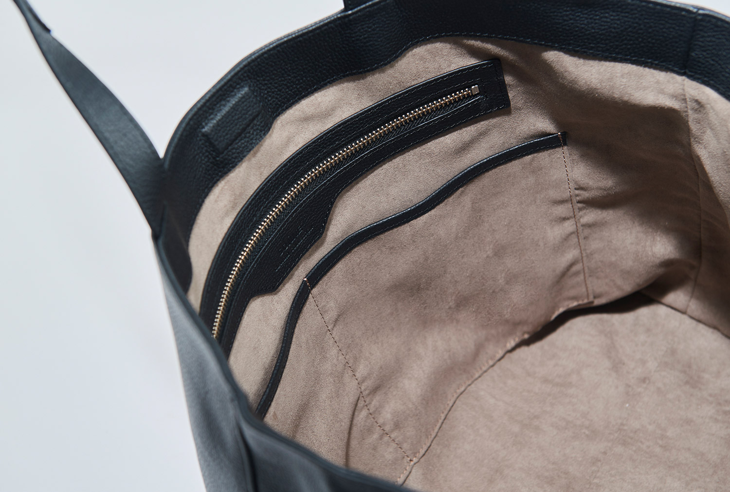 縦型トートと同じく、風合い豊でソフトなシュリンクレザーを使用。台形を逆さまにしたようなベーシックな舟形トートは、合わせる服を選ばないのも魅力だ。内装にはスウェードタッチの起毛素材を当てて4つのポケットとファスナーポケットを配置し、約760gと軽量性を追及しながら、見えないよう開口部にマグネットを内蔵した。