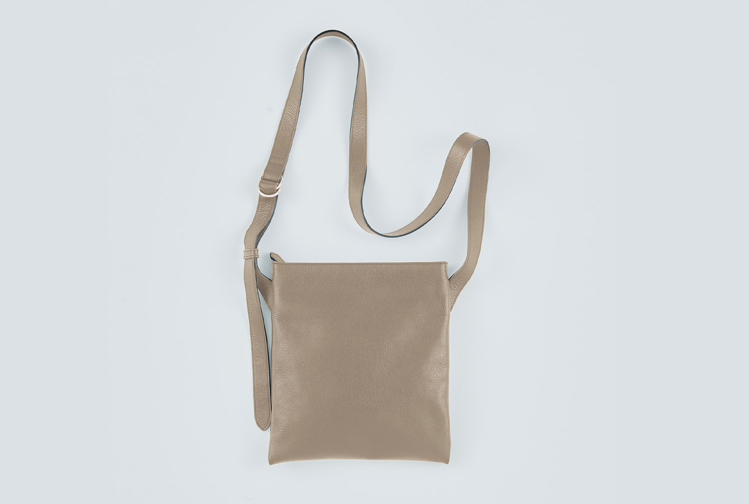 シュリンクレザーを使ったショルダーバッグもロゴを省略し、天マチのファスナーも目立たないように設計されたシンプルデザイン。内装にスウェードタッチの起毛素材を採用し2つのポケットとファスナーポケットを完備するほか、外装背面にもシークレットポケットを備えた。リングベルト仕様で長さ調節も可能なストラップは、本体に対して斜めに取り付けられており快適なフィット感と美しいシルエットを両立している。