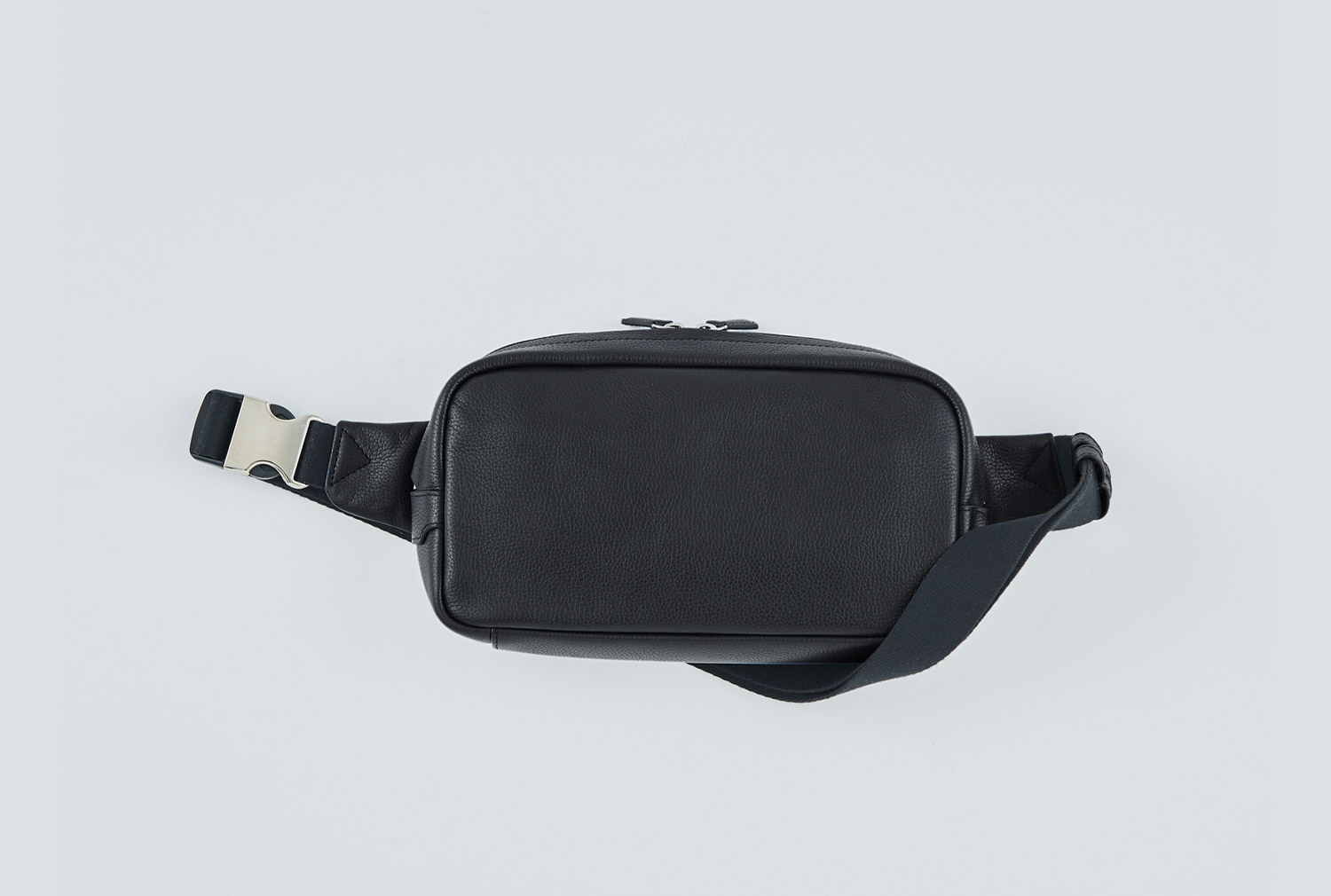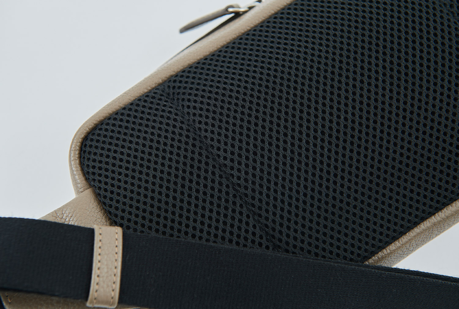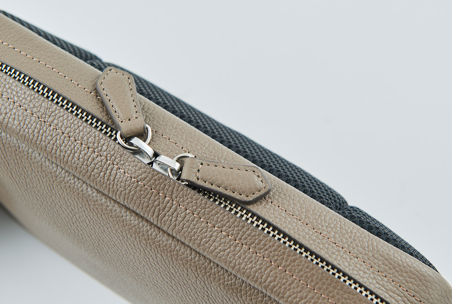 表にはシュリンクレザーを、背面にはメッシュをあしらい、上品なルックスと快適性を兼ね備えたボディバッグ。ポケット4つとファスナーポケット1つを備え、ストラップはワンタッチで着脱できるバックル仕様に。目立たないようにレザーをかぶせた天マチのファスナーは両開き使用で、左右どちらの肩に掛けても中身にアクセスしやすいように設計されている。マチは6cmと薄く、アウターのインに差しても邪魔になりにくい。