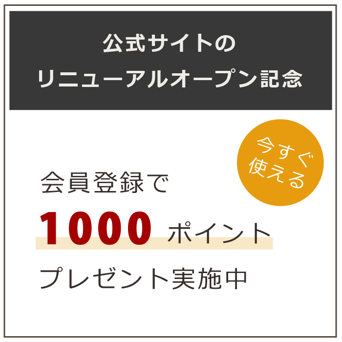 公式サイトのリニューアルオープンを記念して、会員登録いただいた方全員にサイト内で1ポイント=1円分としてご利用いただけるポイントを1,000ポイント分プレゼント。