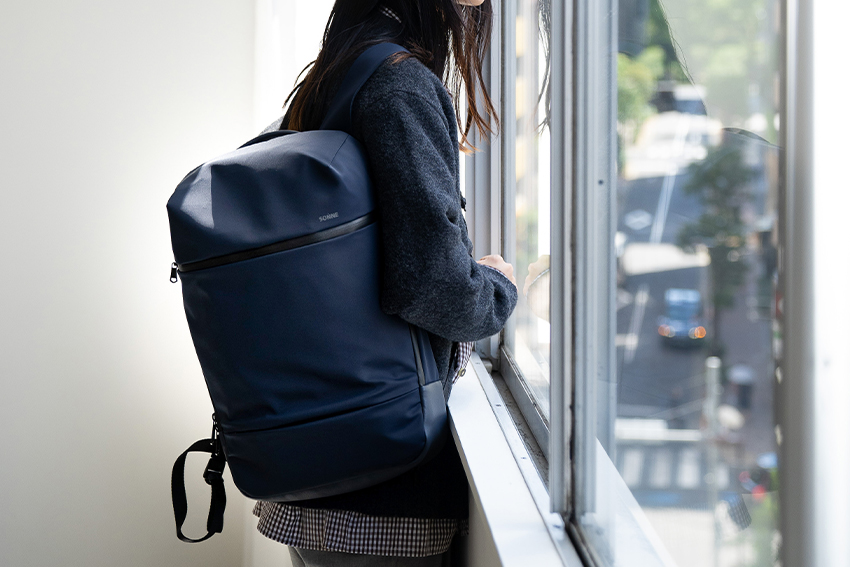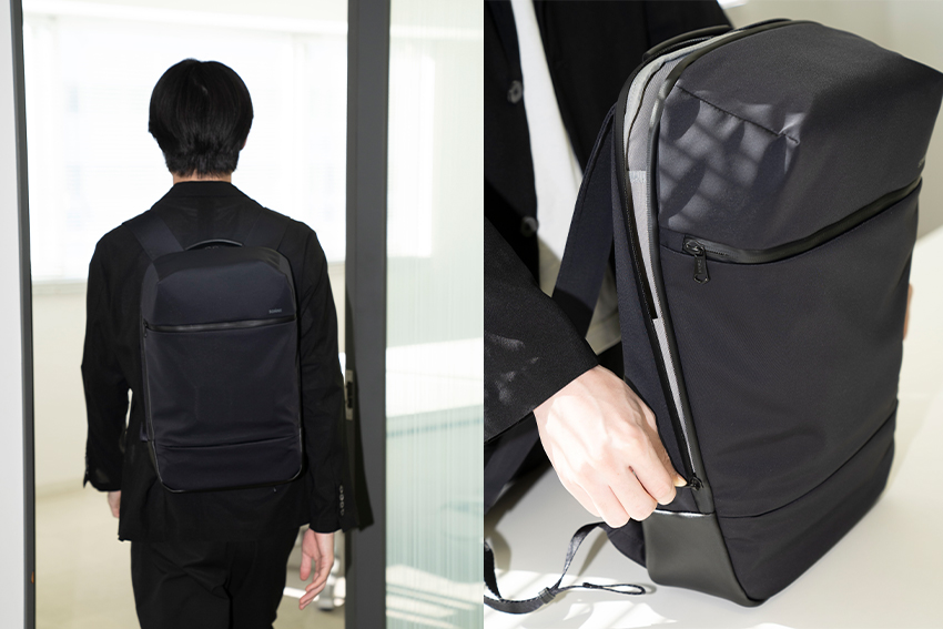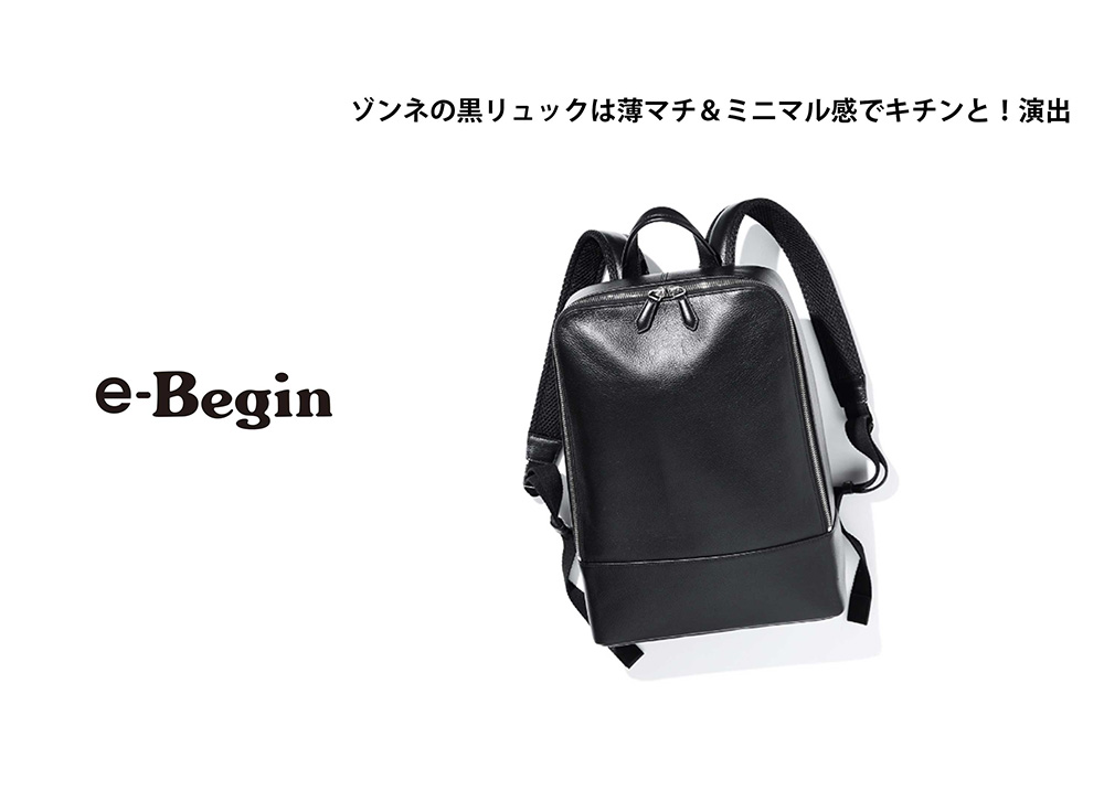 「ゾンネの黒リュックは薄マチ&ミニマル感でキチンと!演出」。